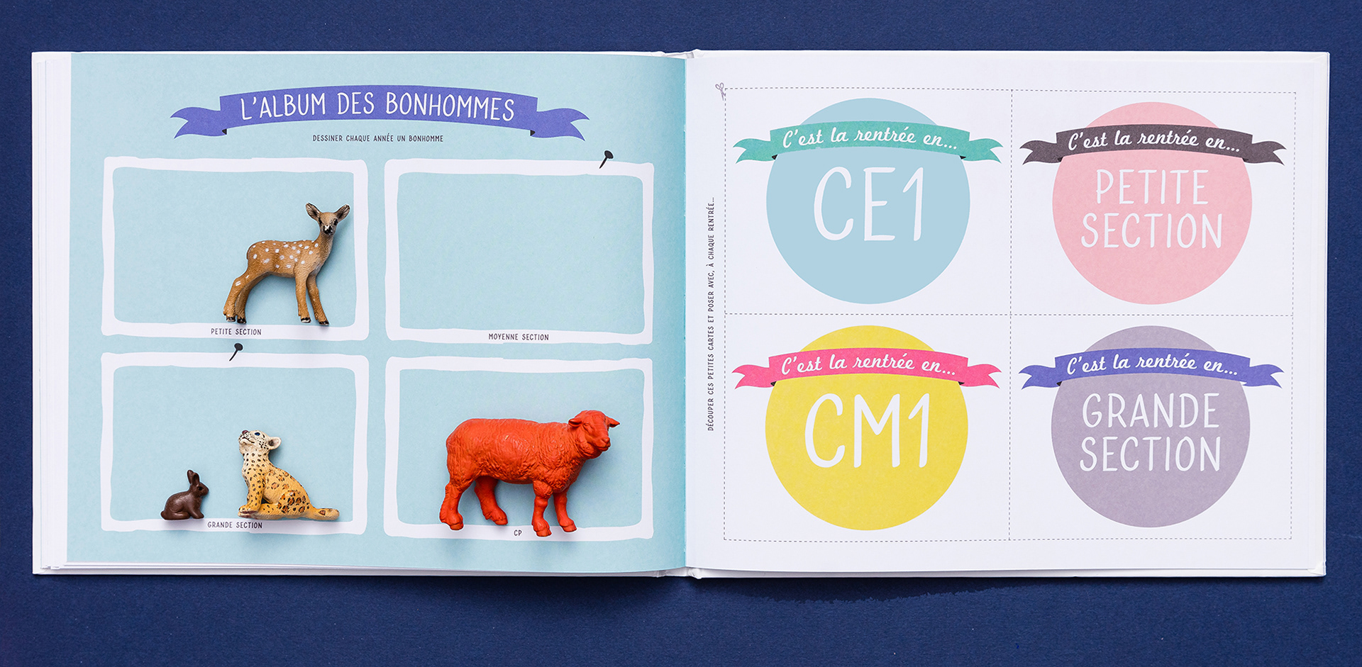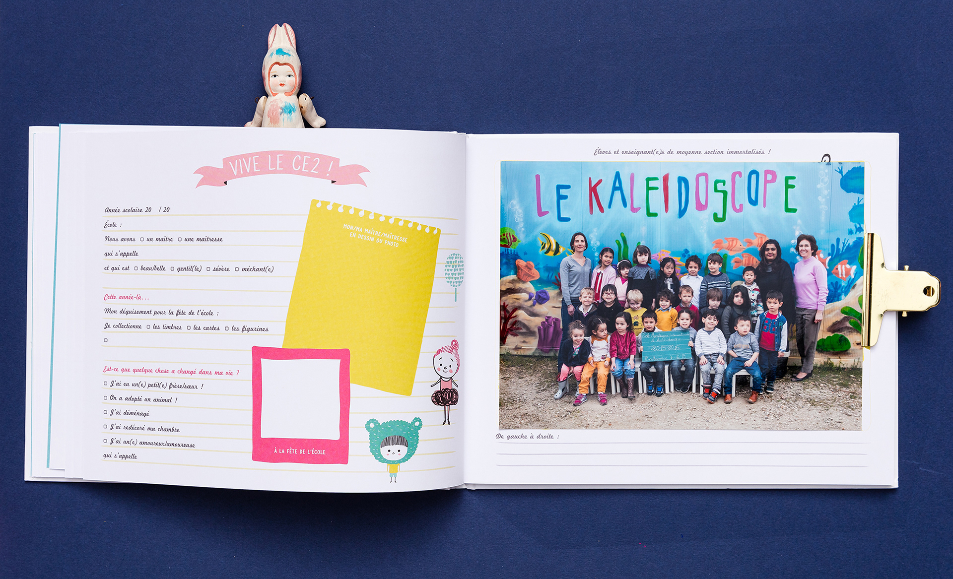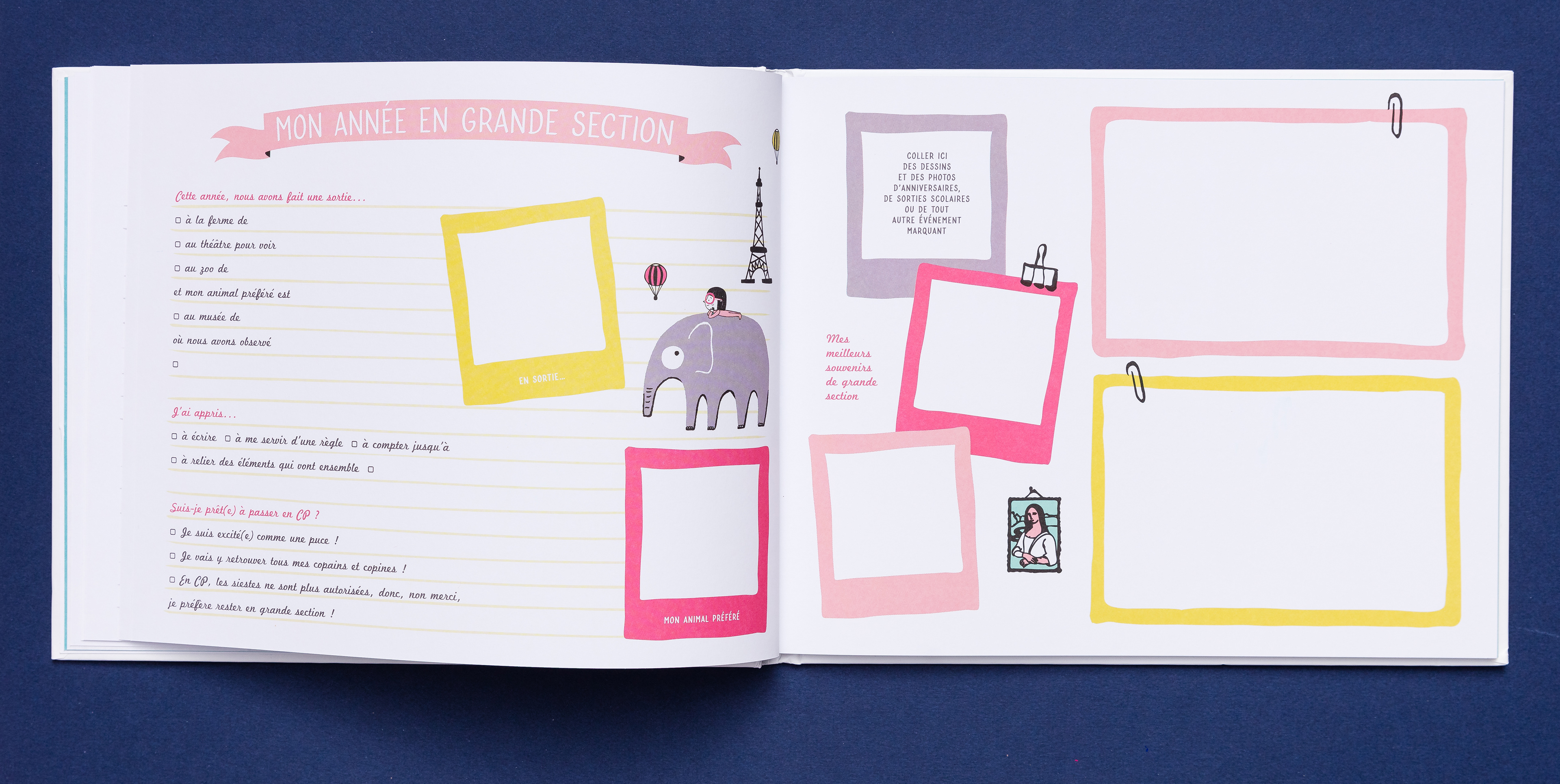 Co-conception, illustration et maquette d’un album de photos de classe à compléter.
